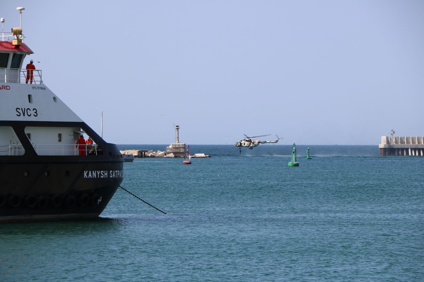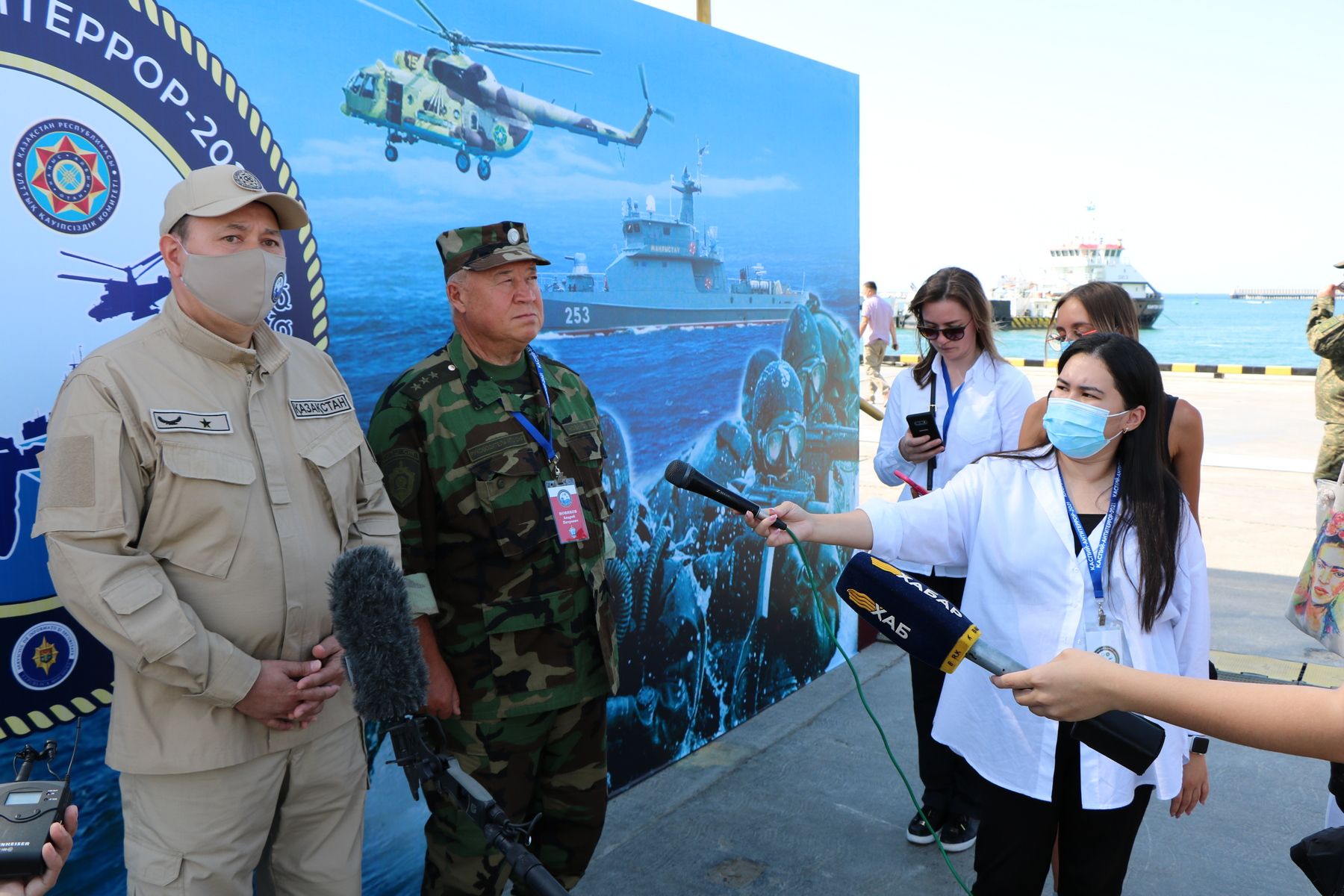 Units of A special forces and border guard of the NSC, Berkut unit of the National guard, Sunkar unit of the Ministry of Interior, special operation forces of Kazakh MoD with the support of the Special operations center of the Russian FSB demonstrated practical actions aimed to detect, block and neutralize groups of simulated terrorists, as well as to release hostages at the hijacked Каnysh Satpayev ship and a drilling rig in the open sea.