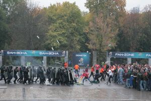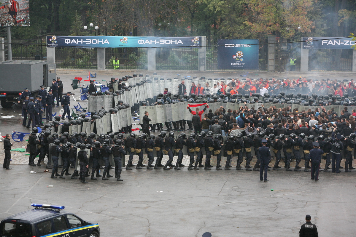 Силами подразделений МВД и МЧС Украины проводилась локализация массовых беспорядков и волнений с участием футбольных фанатов в «фан-зоне», нейтрализация очага химического заражения, вызванного последствиями взрыва, тушение пожара, а также ликвидация последствий и разрушений на хладокомбинате «Винтер» в г. Донецк.
